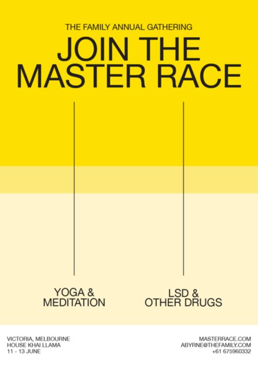 Our main concept was the idea that Anne, the cult leader, wanted to create a family and enlighten them, converting them into a ‘master race’. We took this and created a system that consisted of ‘enlightenment through the generations’. Our symbol represents the branch of a family tree, portraying the connection of all of the followers and how they are a family that is brought together by Anne herself. The colors we chose, different shades of yellow, represent enlightenment through the generations, since the lower the colors go, the lighter they get. All of these applications are a conceptual way to attract new followers, and to explain what the cult is about. We worked to maintain the coherence throughout the project by staying within the restraints of the design system, using the same grid, colors, font, and image style throughout it all.